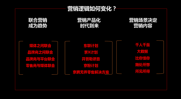 无论是我们前面说到的联合营销,还是营销场景决定营销内容,这都需要借助各种营销产品才能实现。在过去,营销更像是“服务”;而未来,营销一定是“产品”。营销产品化时代的到来,为各大平台带来了机会,而电商平台一定比任何平台都更具优势,因为电商平台是离消费者、离商品最近的一种泛媒体。这也就是我想在这篇文章想给大家介绍的内容,我将为大家一一介绍京东为无界营销准备的产品矩阵。殊途同归,电商平台的玩法基本一致,大家今后在逛天猫淘宝、苏宁时也可注意观察。